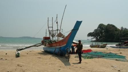 February 3, 2008Helen – Another easy relaxing day. We decided not to go to St Mary’s church since we didn’t understand anything last week. We miss St.Theresa in Colombo. We went northwest today to visit two beaches, the closest being Marissa which is said to have some of the loveliest beaches and Welligama which is also a fishing port. It didn’t take long to reach Welligama. Parking the car under some trees, Tom paid a man to watch the car. This beach had lots of shells and we spent some time looking for the ones we have been collecting. The beach also had lots of multicolored fishing boats with nets drying around them. We stopped by one boat and the man gave me a lesson on how to fix the torn nets. I remember my mother knowing how to make net bags for carrying things…but then she knew everything!!