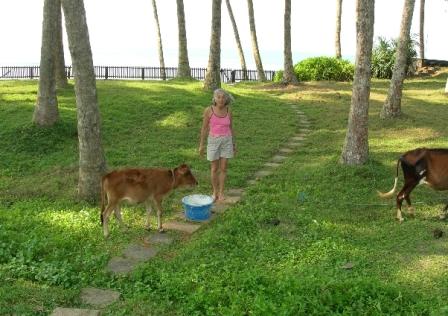 While the storm was still going on, the cow and calf were separated on two different sides of the yard and the baby didn’t look too happy. As the rain let up some, I first took the washed clothes off the line (had to re-rinse and spin) then went to move the mama to the baby. Tom said leave them alone…nothing doing!! I wade through the valley in the back yard to get to mama and begin to untie her lead. I am facing away from her and with no warning she jumps up onto my back with her front hoofs on my shoulders. Talk about scared and surprised!!! I jumped forward and she fell off of me. Tom was an amused bystander and wished he had the camera!! He said just leave her there…but I was not going to stop now. Sometimes, I wish I weren’t so hard headed and would mind my own business!!