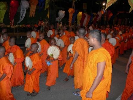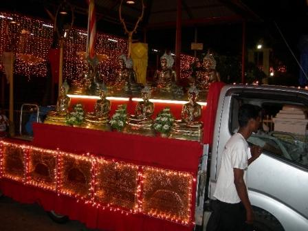 Ruki had bought tickets for us ($60 donation to the temple) to sit in the first row on a stand with the dignitaries near the temple. We were told we had to be there by 6:30pm to make sure we were in our seats by 7pm when the parade started. Sherry, a Fulbright Ph.D. candidate from Arizona State accompanied us. Sherry is doing her dissertation analyzing the book covers of 18th century Buddhist manuscripts. After arriving by Tuk-Tuk we had to go through tight security (frisking, separate stall for women) before we could proceed to our seats.