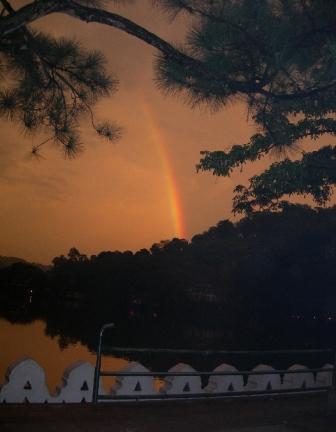 Since Raj had driven us we had to return to campus to get our car. The traffic was horrific!!! It took us nearly an hour for the return trip and meanwhile he missed picking up his wife and two children (3 and 4 ½) from daycare. Our return trip to Kandy was now at dusk (not a good thing with Tom’s bad night vision with the new lens) and the traffic was still just as bad. I took a picture of a rainbow as we turned onto Kandy Lake Drive.
