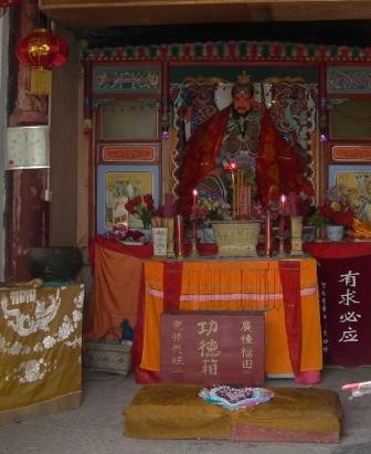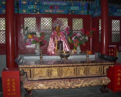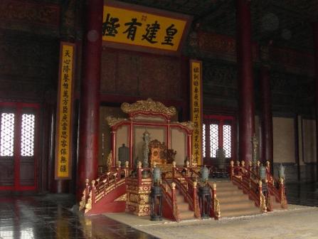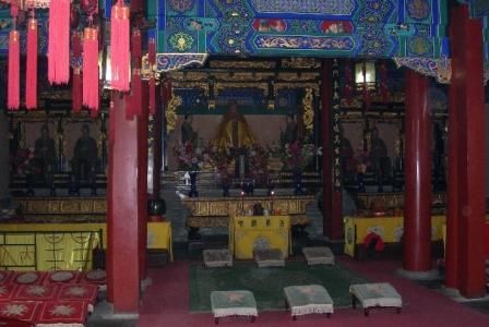 You enter an impressive yellow-tiled gate and then walk through a series of large halls (each a separate building). There is a large statue of the emperor seated upon a three-tiered marble terrace in the Hall of Eminent Favors. The roof is supported by at least 20 huge (3 ft diameter) solid cedar wood columns.
