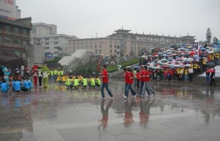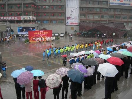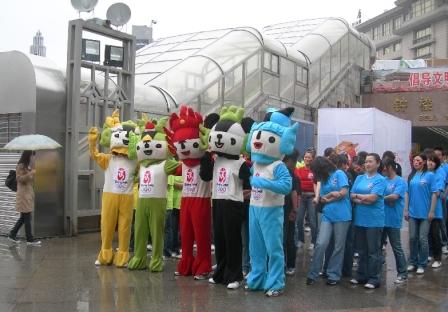 May 8, 2008Tom – As usual, we ate our breakfast at the hotel buffet and then again tried to go to the bazaar. It was raining but in the square across from the Bell Tower there was a pre-Olympic rally taking place. It began by introducing the “Five Friendlies” – Beibei, Jingjing, Huanhuan, Yingying and Nini – the Olympic Mascots.