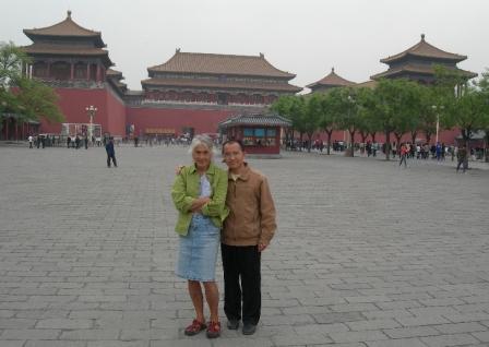 Just inside the Meridian (south) Gate of the Forbidden City (also known as the Imperial Palace) we hired a young man named Wong to serve as our guide. Helen and Wong are standing in front of the Gate of Supreme Harmony.
