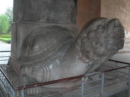 The largest stelae (inscribed tablet) in China is located here inside of a pavilion. Like many in China, it is supported by a mythical tortoise-dragon-like animal.