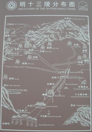 May 12, 2008Tom – Today was a cool/cloudy day and it was spent at the Ming Dynasty Tombs an hour NW of Beijing. It was a huge area (as usual) tucked in below the mountains. The picture of the map will give you some idea of the size of the Ming Tomb area.