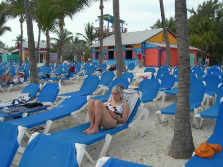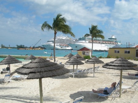 There was a “Sail Away” party at 5pm after which we went to our assigned dinning room for dinner and then went to the Welcome Aboard show in the evening. The next morning the ship set anchor off CocoCay, a small Bahamian Island used (owned?) by Royal Caribbean. We boarded the launch at 9am to spend the day on the island. It was partly cloudy with the temperature in the high 70’s – perfect for starting our “winter tans” to impress the folks back home.