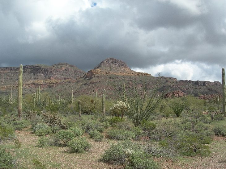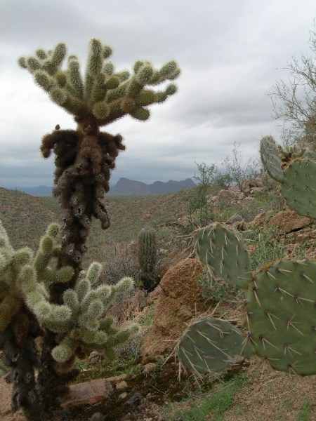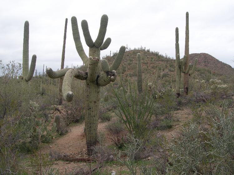 Sunday March 7th – We woke up to cold and rain but by the time we drove to and went through the Visitors Center of Organ Pipe Cactus NM most of the rain had stopped. We hooked up with a couple who had stayed at the same B & B (He is the state Grizzly Bear specialist for the state of Montana) and completed the Desert View Nature Trail (1.2 miles), shared a picnic lunch, and drove the Ajo Mountain Drive (21 miles) completing the Arch Canyon trail (2 miles) and the Bull Pasture trail (3 miles). We had a reservation for an observation program at the Kitt Peak National Observatory (world’s largest collection of optical telescopes) but it was canceled due to the weather so we continued to our Days Inn north of Tucson for the night.