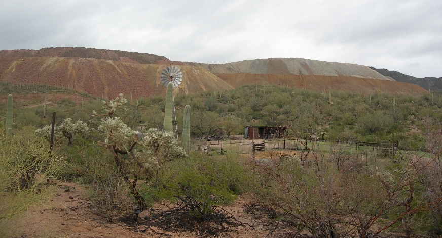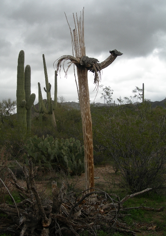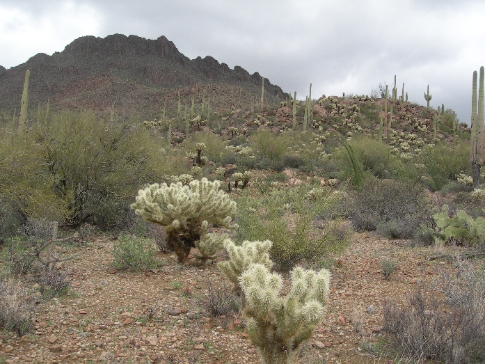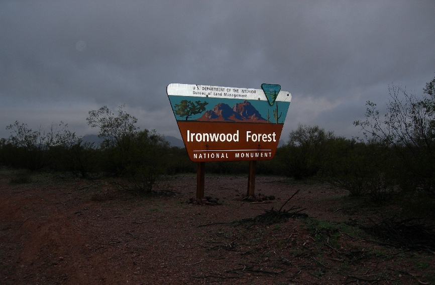 Monday March 8th – After a 6am continental breakfast, we drove to and through Ironwood Forest NM in cold and rain. In fact we literally “slid down” one hill on the dirt track, first bouncing off one beveled shoulder and then the other, in our rented Ford Escape SUV. The Ironwood tree is one of the longest living trees in the Sonora desert. Ragged Top Mountain is a monument landmark as well as the Silver Bell Mountains for which the still active Silver Bell Copper Mine is named.