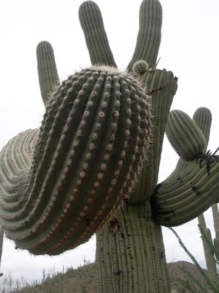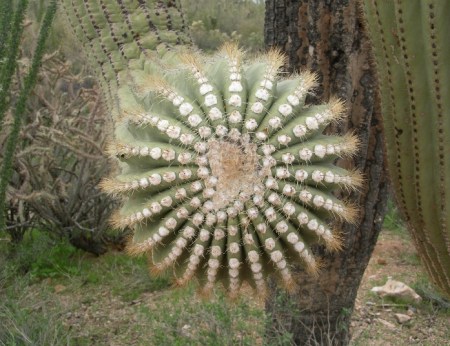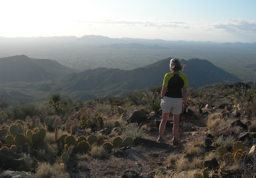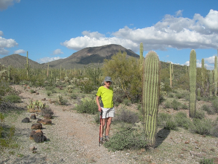 After driving back to Phoenix to pick up Helen’s bag, which arrived from Detroit at 12:30, we drove to Sonora Desert NM and took a 15.3 mile dirt track to the start of the trail leading to the summit of Table Top Mountain in the like named Wilderness area. Because of our late start, we had to hustle to complete the 7 mile round trip (ascending over 2000 ft) to the top. A cacti jumped up and bit the back of my hand on the way up (see pic). We had a dramatic panorama of rugged mountain ranges and desert plains from the top. It was dark by the time we got back to I8 and proceeded to the Guest House Inn B & B in Ajo, AZ.