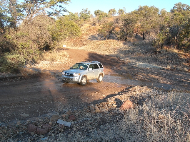 We next drove through Phoenix and then north to Agua Fria NM. We had little information about this Bureau of Land Management (BLM) National Monument. According to the internet description – “it is an expansive mosaic of semi-desert, cut by ribbons of valuable riparian forest and offers one of the most significant systems of prehistoric sites in the American Southwest.” Our objective was to get to the Pueblo la Plata archeological site and back before dark. The first part of the Bloody Basin dirt road was rough but then we forded the Agua Fria River on to an unmaintained road. Even though we had a small SUV, it was only two wheel drive and this road was a real challenge.