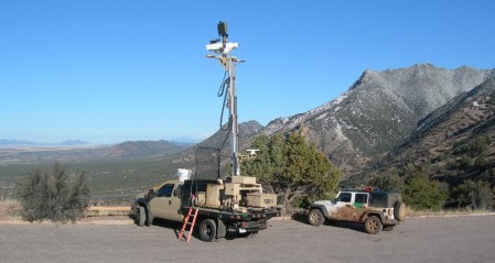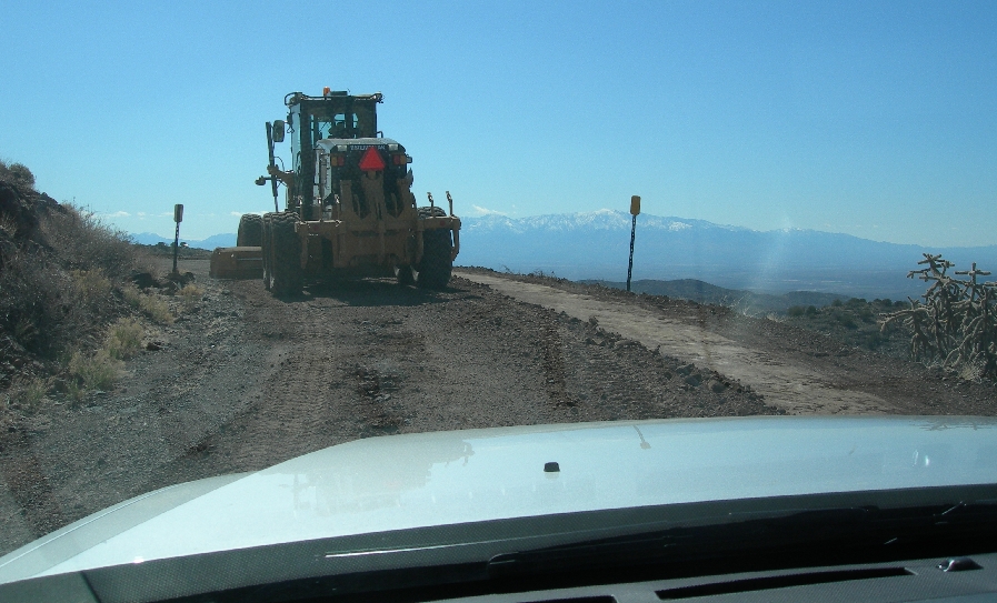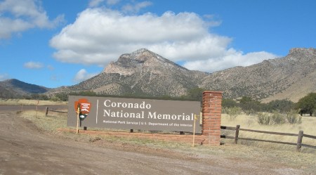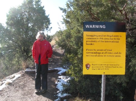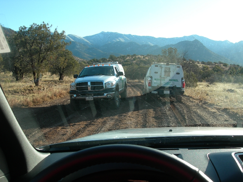 Tuesday March 9th – Drove south from Sonoita to Parker Canyon Lake and then took a dirt track called Montezuma Canyon Rd to Coronado National Memorial on the Mexican border. It was an adventurous trip negotiating the mud, fording the streams and then getting caught in the middle of a Border Patrol search for “illegals” (emigrants or drug dealers). We were the only ones in the area beside about 20 border control vehicles (some armored) and a helicopter! After reaching the Memorial (this “Memorial” has the requisites to be a national park), we took a short hike (about 1 mile roundtrip) to the top of Coronado Peak (6,575 ft). We were surprised to be in snow this far south, when it was in the 60’s back in Ohio! From the top we could see the new and old sections of the fence built along the U.S. – Mexican border. There was also Border Control radar set-up in the trail head parking lot.