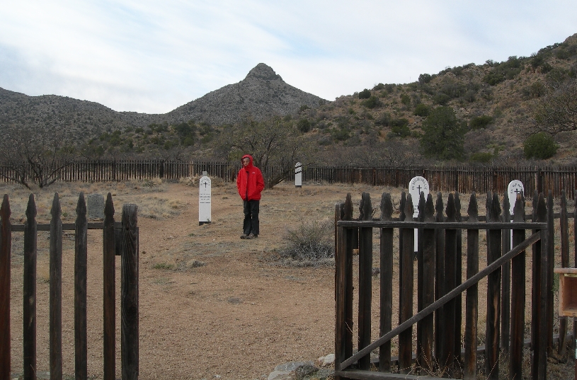Wednesday March 10th – after spending the night at a Holiday Inn Express in Wilcox, we drove to Fort Bowie National Historic Site. As we turned on to the dirt road to reach the trail head (40 miles from Wilcox), Helen informs me that her glasses are missing; no where to be found, perhaps she left them by the computer at the Holiday Inn. OK, let’s think about this. We drive through Apache Pass (site of wagon train massacre) and then do the 1.5 mile hike past the Butterfield Overland Stage coach station, the fort cemetery (Little Robe, Geronimo’s 2 yr old son, is buried here – Helen’s rock can be seen in the background), the site of the battle of Apache Pass, and the First Fort Bowie ruins to the Visitor Center. It was a cool crisp morning and the hike with reflection on the historic events that occurred here was invigorating. We hiked back to the SUV by way of the Overlook Ridge trail (1.5 miles).