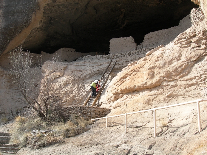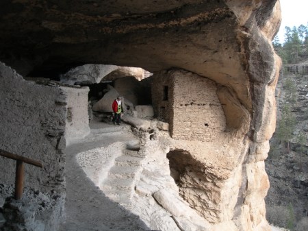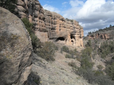 After passing through Silver City, we took State Highway 15 north through the mountains. It was a windy, at times one lane road, through snowy passes to Gila Cliffs NM. We watched the video at the Visitor’s Center and then headed for the trail to the Cliff Dwellings. We were told that we could not do the loop trail through the canyon and then past the ruins because of trail construction. However, we reversed the loop and did the trail to (and through) the Cliff Dwellings and then down the canyon, bush whacking around the trail bridges that were being reconstructed.