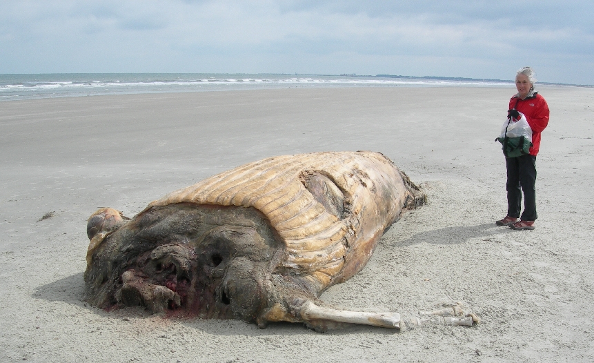 This is a sperm whale carcass that washed up five days before. The rangers tested it and then cut off its head so that if it washed out to sea and then returned again they would know they had already analyzed it.