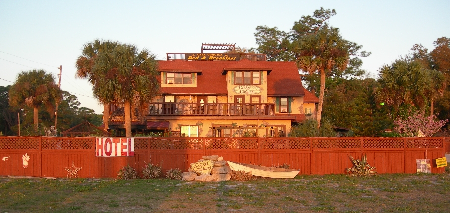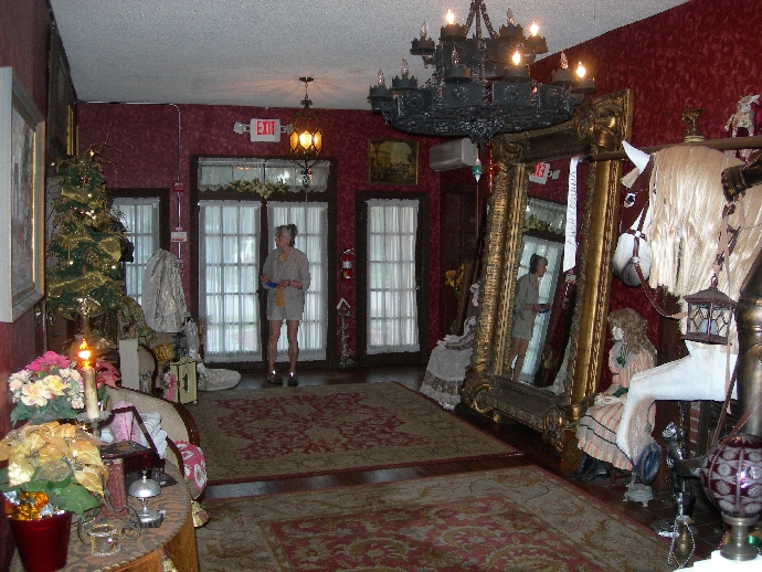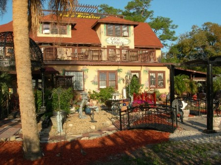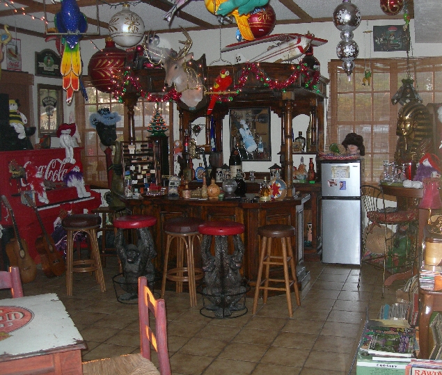 We reluctantly stayed the night at the Casa Coquina B & B in Titusville. It was dark when we arrived and there were no cars or people around. We had to call to gain entry to this 1927 eclectic mansion? An old woman, who emphasized that she would not be staying the night first showed us the unique bar. We were offered some free decanted red wine but the thought of spiked spirits crossed our minds. We were then shown the doll wedding chapel and rooms full of flea market items for sale, before going upstairs to our gaudy suite. Helen was afraid to stay but didn’t tell me until after the credit card transaction – maybe it was the life size horse with armored conquistador and the mannequins everywhere. We had dinner at the Cuban restaurant across the street and asked the waiter and manager about the place. They said it was probably OK because no one had died there recently. Helen had visions of an Alfred Hitchcock thriller!