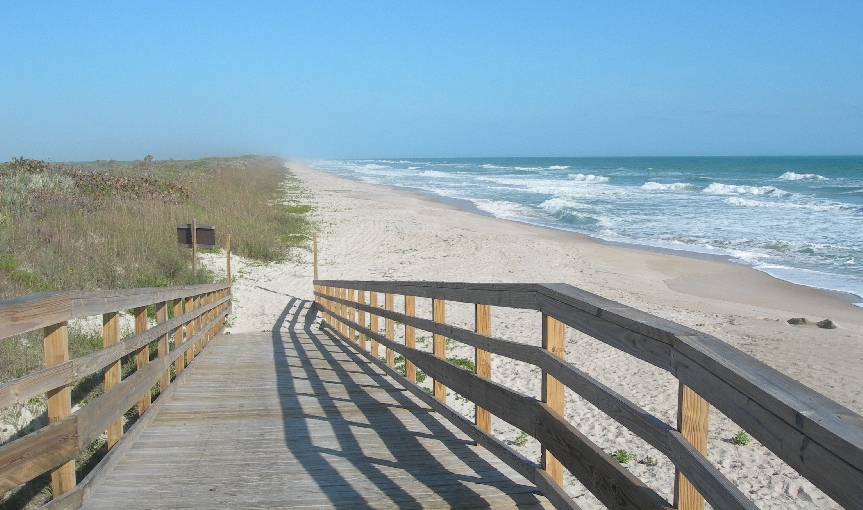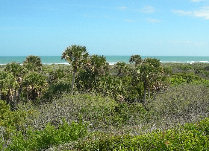 The shuttle Discovery made its last landing today at 11:57am. We drove about 30 miles to the north end of the seashore and parked on a bridge to try to see the descent. Unfortunately for us, the shuttle landed from the south instead of the north. The following picture was taken from the top of Turtle Mound. It is one of the largest middens along the east coast of FL. A midden is an area where discarded food and other unwanted items were thrown in large quantities. This mound, built primarily from oyster shells, was shown as a navigational point on Spanish maps but has eroded to about 40 feet in elevation.