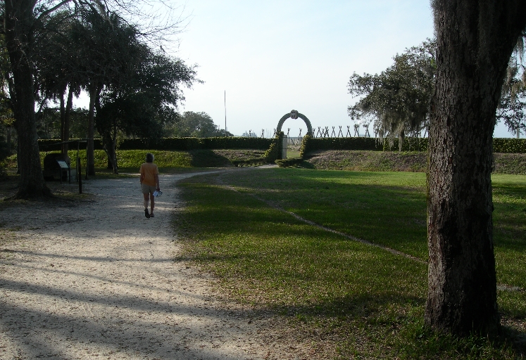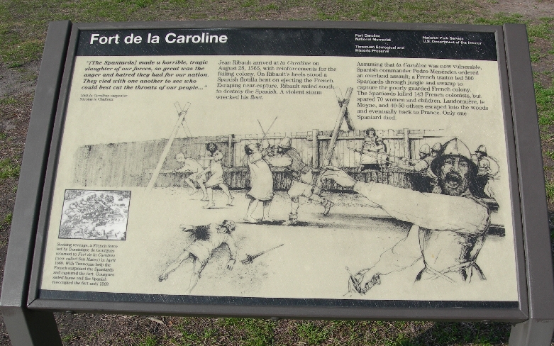 Fort Caroline National Memorial is located east of Jacksonville FL. It was built by the French in 1564 to get a toe hold on the east coast. The Spanish attacked the next year and slaughtered about 140 settlers and a bit later killed another 350 who were ship wrecked trying to escape. In 1568 a French force took revenge by slaughtering all Spanish at the fort and then sailed for home never to return to the east coast. Fort Caroline is now part of the Timucuan Ecological and Historic Preserve.