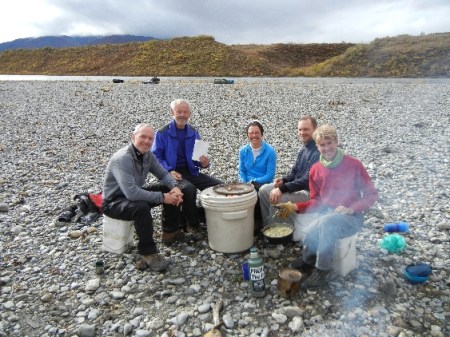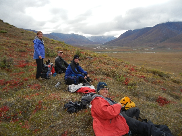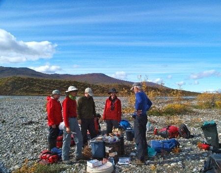 Dave was able to find and get some pictures of the Muskox and followed it down the ridge to the river. Our group hiked back to where Dave had last seen it but was unable to find it. Following our short hike we had another creative dinner. The food has been good and healthy, if you make the right choices! Karen put together a variety of dehydrated, fresh and packaged food. There have been only a couple of things out of cans (e.g. chicken and tuna). She pre-mixed many meals before the trip and put them in zip lock bags. We also have treats like mixed nuts, dried fruit, cookies and chocolate. For example, I especially liked the lunch sandwiches we made with turkey-pastrami loaf on 12 grain bread with brie as a spread and Fig Newton’s for dessert!