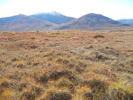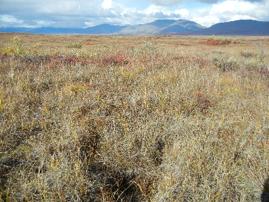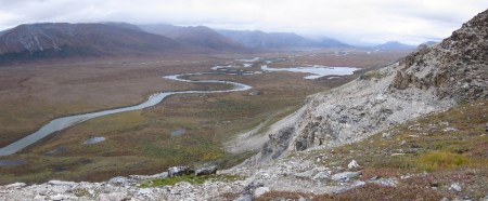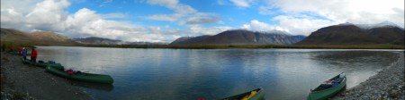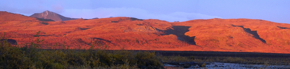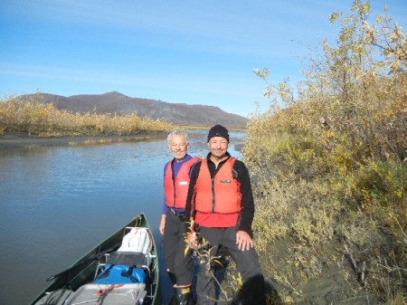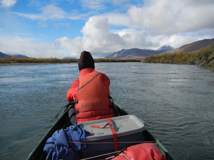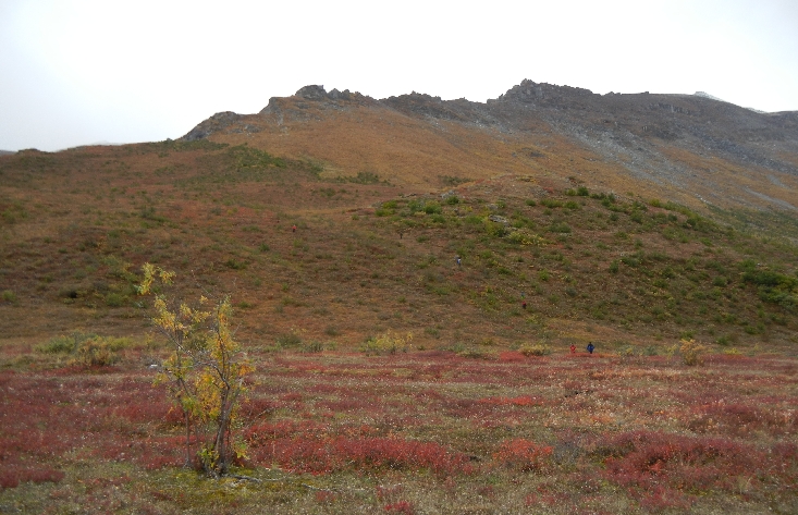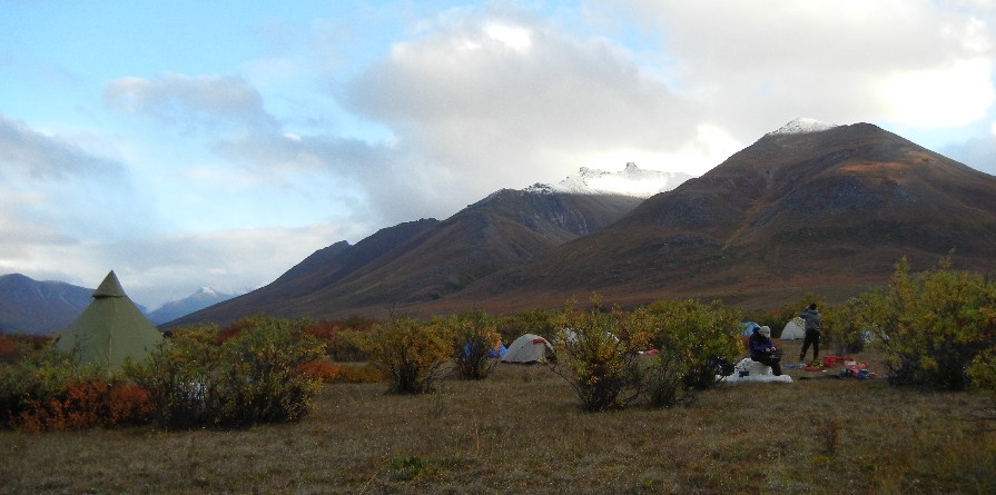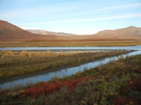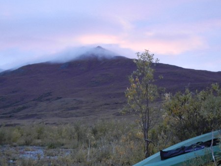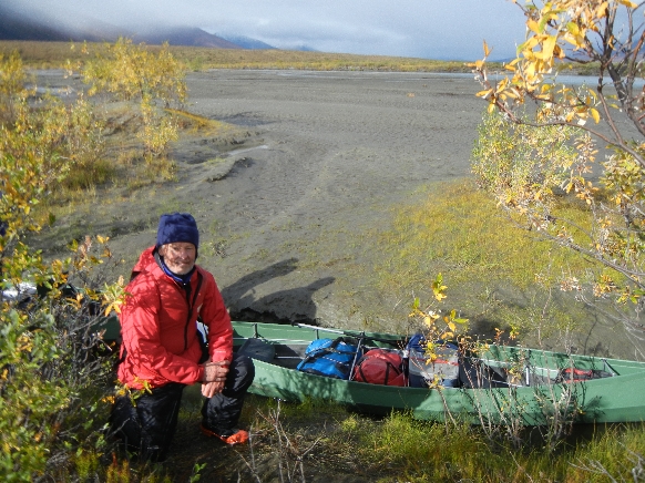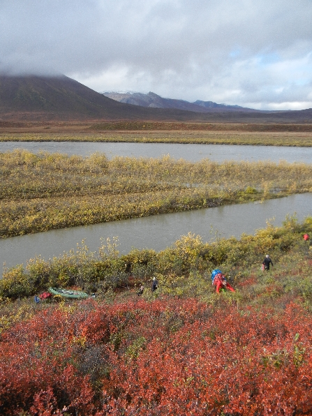 We paddled back across the river and set up camp on the opposite bank. Dave went in search of a Muskox he had seen on a ridge with his binoculars and I hiked up the opposite ridge. It was an honor and indeed a pleasure to be walking through the varied and beautiful vegetation of the tundra adorned in its magnificent colors. I sang each of my special songs for Helen, Stacy, Peter, Kate and Chad as I reveled in the moment. Ingling River emptying into Noatak, camp a bit right of middle of picture –