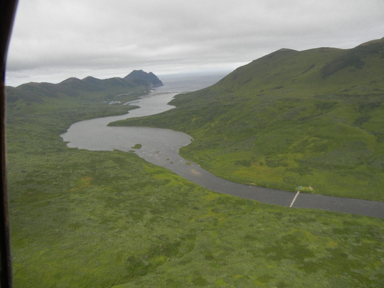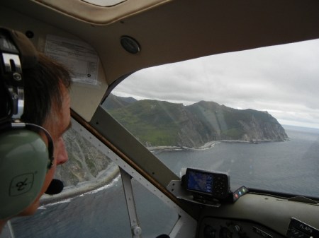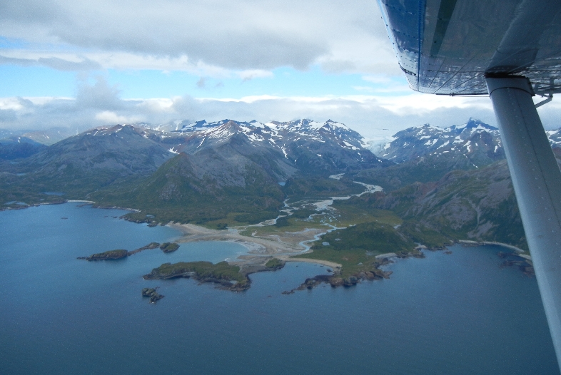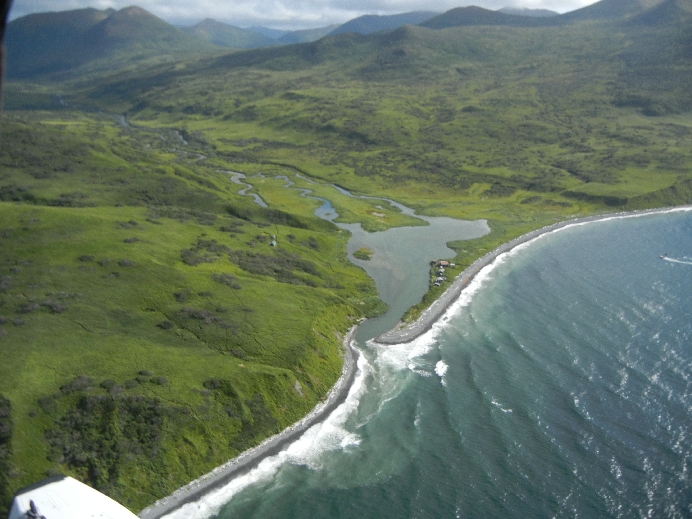 I was startled when the engine stopped but it quickly started again – Rolan had switched to the other gas tank! We passed over a hunting/fishing lodge as we crossed the west coast of Kodiak Island.