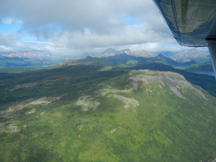 On the way back to Kodiak, we flew on the west side of the Alaska Range of the Aleutian Peninsula. This is the location of the Alaska Peninsula National Wildlife Refuge and the Becharof National Wildlife Refuge. We were able to see several bear and a moose from the plane. This is Ukinrek Maars and Becharof Lake –