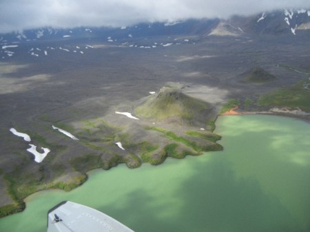 This is perhaps the least visited of the national park units and I had read that only about 7 to 10 parties per year enter the caldera. Aniakchak is difficult to get to and has severe weather most of the year. Our first stop was at some mineral springs (orange)feeding the lake. I would guess the water was about 60o F. The volcano is active and last erupted in May 1931.