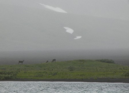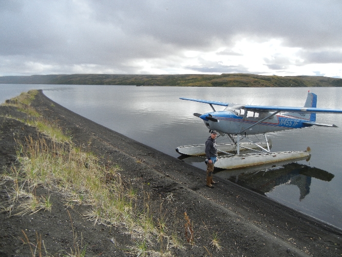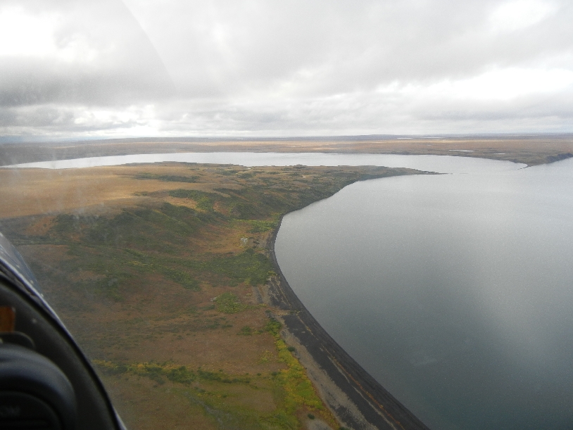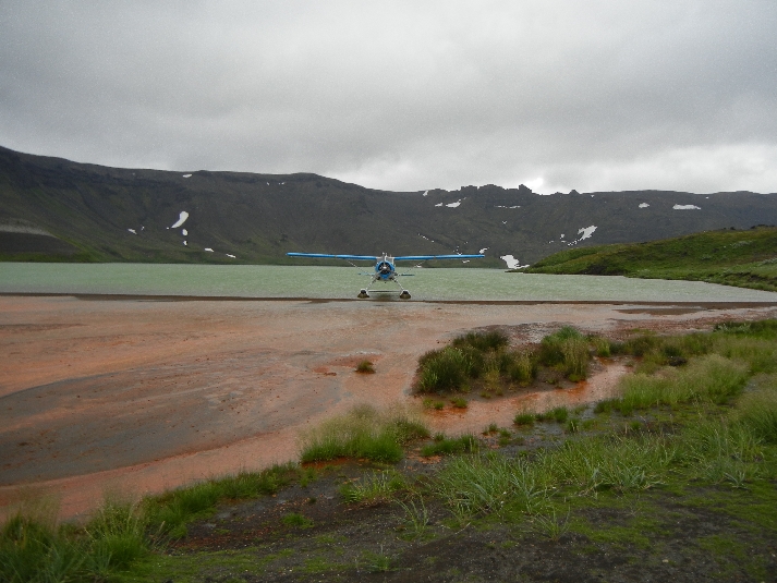Our two hours of ground time passed quickly and a rain squall was rolling over the west side of the caldera rim so we returned to the plane, pushed off the beach and drifted while Rolan filled the gas tanks in the pontoons from gas containers stored in the plane. Right before take-off we saw a grizzly bear on the east side of the lake and caribou on the west side.