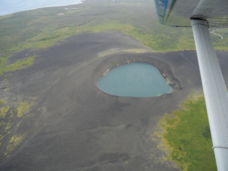 We considered landing on Meshik Lake in Aniakchak NP but upon circling it Rolan decided it was too shallow. So, we headed for “The Gates,” which is a notch cut about 2,500 feet in the caldera wall where the Aniakchak River flows out of the crater and to the ocean. It was a bumpy ride through The Gates and entering the caldera. We circled Surprise Lake twice before landing.
