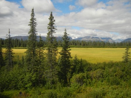 The terrain opened and was dominated by relatively small spruce trees and hills as we approached Fairbanks. We arrived in the “Golden Heart City” at 8pm. I called Al from the Downtown Log Cabin B & B and he picked me up at the train station.