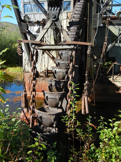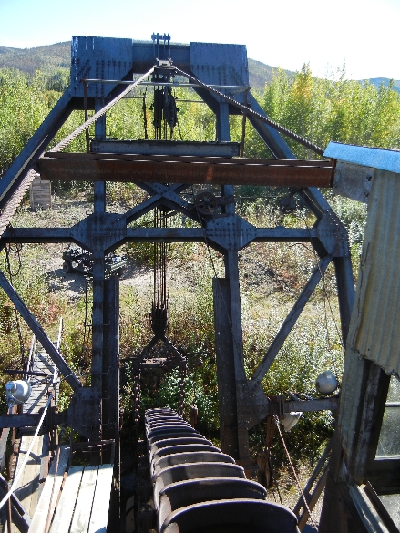 The “Dredge” was made in 1935 in San Francisco for $146,425. The parts were brought in via the Yukon River and skidded on the frozen ground about 6 miles up Coal Creek to where a pond had been excavated. Buckets to lift ore –