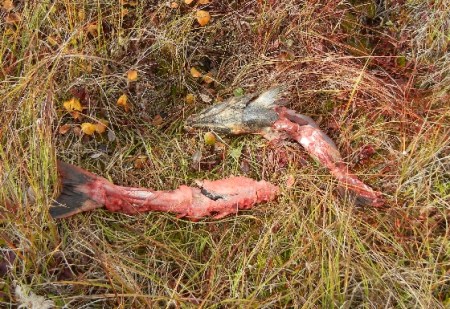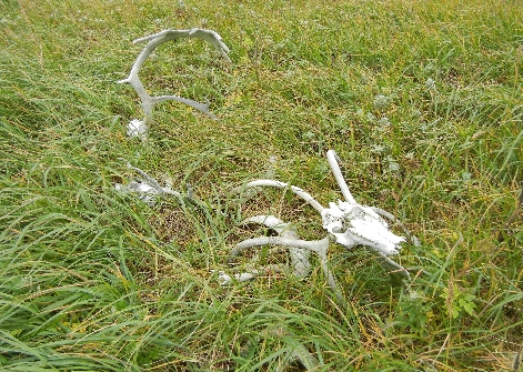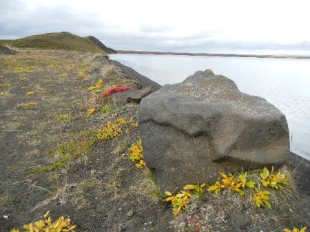 We spotted some caribou along a stream running into the Lake and carefully descended the cinder cone to see if we could get closer. Following the stream we discovered the skeleton of a young bear. Bears are known to eat their young!