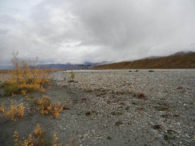 Hallelujah, a plane arrived about 6:30 as we were eating. It circled, flew low over the gravel bar checking it out, and then landed using only about 200 feet of the gravel bar. It was one of those small fat tire planes flown by Jared of Golden Eagle Outfitters. We learned that they had come looking for us yesterday after the expected call from Karen was not received but did not find us.