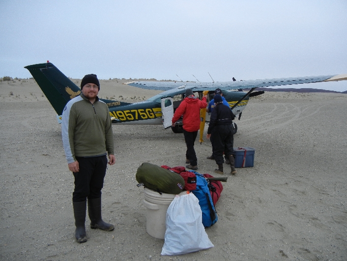 Rick, Matt and Andy packed quickly and left on the first plane and a second plane landed immediately. We asked the pilot about getting all ten of us to the dunes that evening. He stated they were told they were only picking up seven passengers! The second plane could only take Dave, Barbara and gear. The first plane returned at about 8:30 after picking up fuel at a cache. Kevin, Carla and I were boarded and Karen and Steve remained behind on the gravel bar.