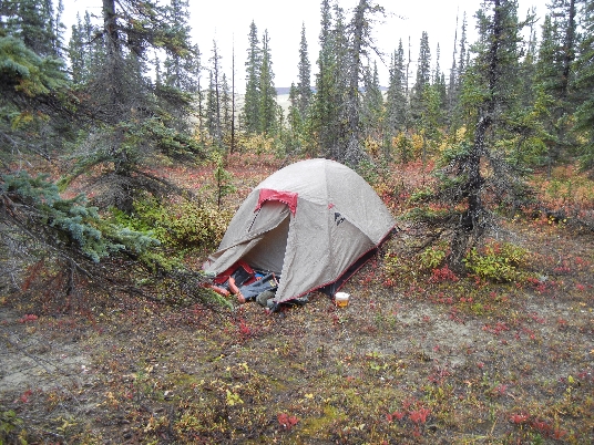 It was raining when we landed and we had to set up camp in an off and on again rain. Of course all of our outer clothes and the outside of the gear in the canoes were drenched.