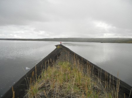 The water was high, so some of the common rim was under water. I walked part of the rim past fresh bear tracks and scat and had the pilot take my picture while standing on the rim with my boots partially in the water.