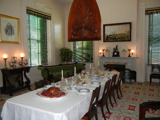 Dining room with “pukah” (hanging mahogany fan) that was operated by a slave to shoo flies from food
