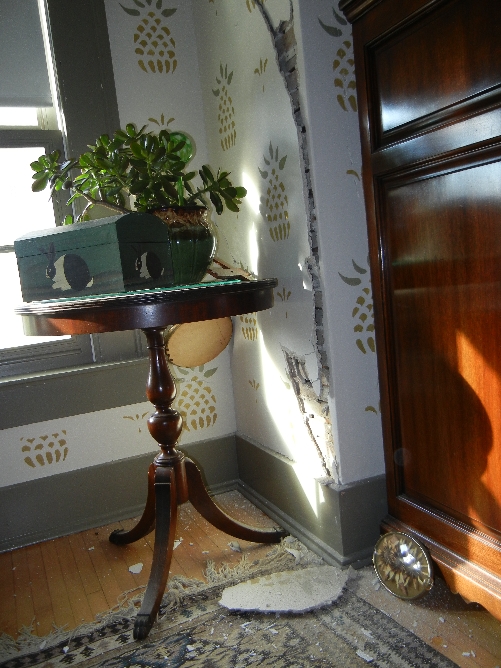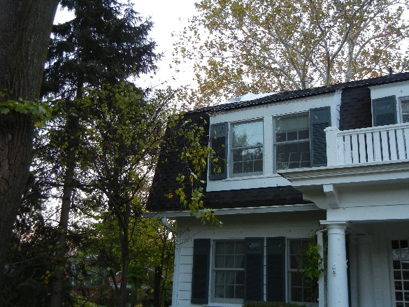 The wicked witch (wind) of the west struck at 11:45pm on Halloween Night. I was sound asleep and must have jumped a foot out of bed when a huge limb blew off our tulip poplar in the front yard and hit the roof above our bedroom. Plaster filled the air and I thought one of our windows blew out. The electricity was out, so I got out my headlamp, flash light and rain jacket to survey the damage. I checked the attic and discovered one of our chimneys was gone! The fire department came but was unable to help. These pictures are from the next morning when a tarp was put over the chimney hole on the main roof. This is going to be a long term step by step process to get all of this repaired.