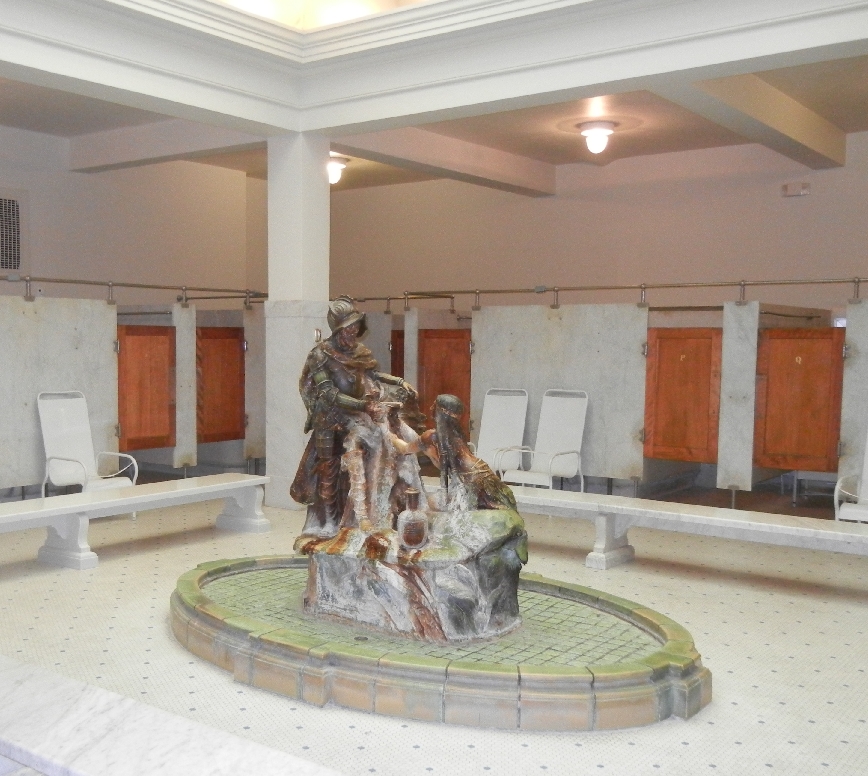 Bath Routine: Tub on right for 20 minute soak in 105 degree mineral springs water, followed by attendant rubbing you down with a luffa bath mitt, then a Sitz bath sitting in 110 degree water (center right), then a steam cabinet for 5 minutes (left foreground), then hot packs for specific joints (table right) and finally a pinpoint shower from all directions.