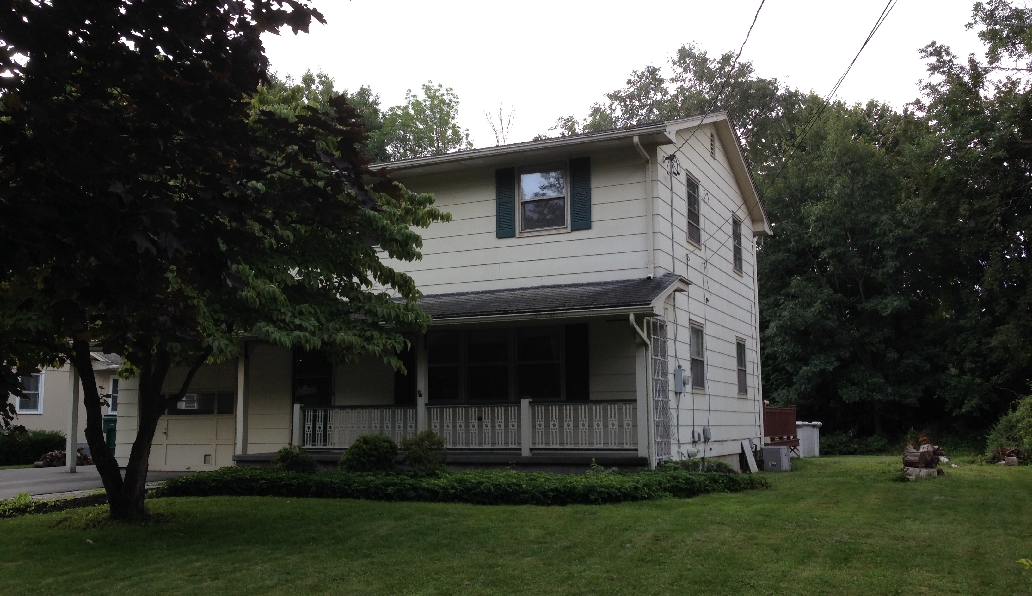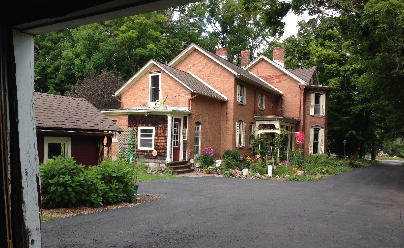 We lived in two rooms and slept on the floor in sleeping bags for six weeks as we put on a new roof and gutters, new septic system, new chimneys, repaired plumbing and electric, cleaned the place up, etc. That way we were able to rent it while we were gone. The 20 x 40 pool is behind the small “dairy” building in the middle and there was an apple orchard behind that.