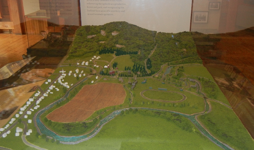 I first toured the visitor center at the Billings farm. This model shows the farm and Mount Tom. The park continues past Mt Tom to the west including reforested hills, pastures, carriage roads, trails and the Pogue, a pond tucked in the cleft of the mountain.