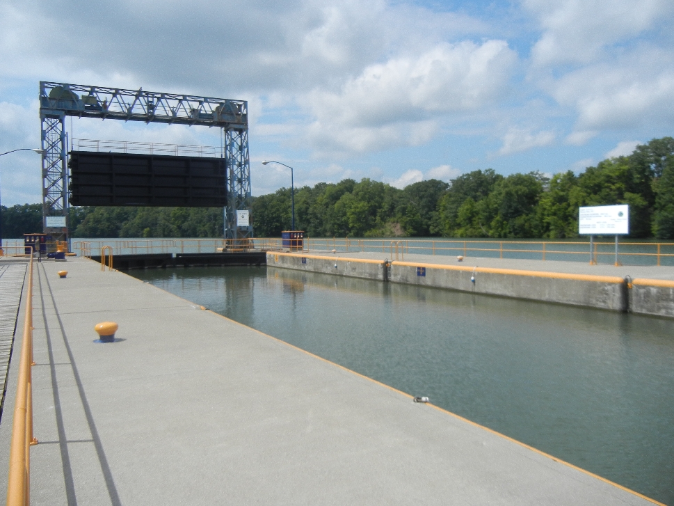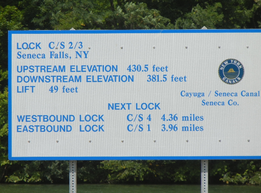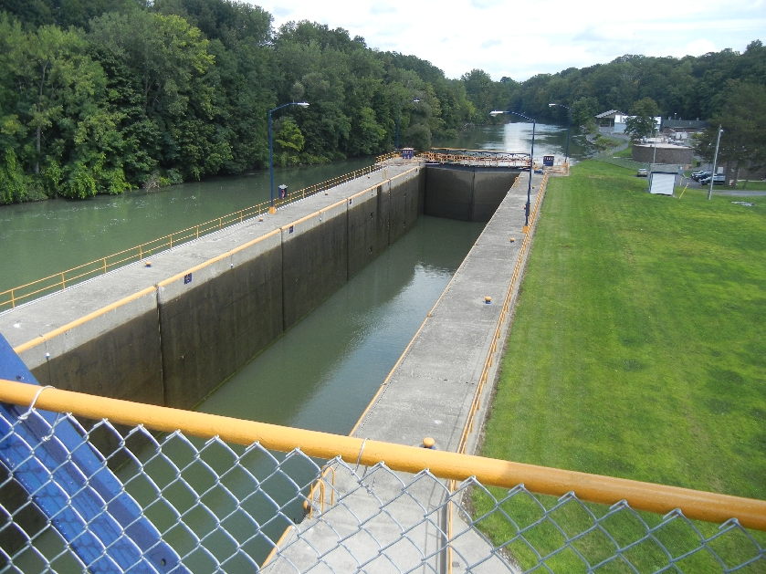 Most recently called the “Barge Canal,” the Erie Canal is now mainly used by pleasure craft. Several bikeway trail segments are located along the canal. A double lock structure (C/S locks 2 and 3) and a power plant are located at Seneca Falls. The following views are looking west at lock 3 –