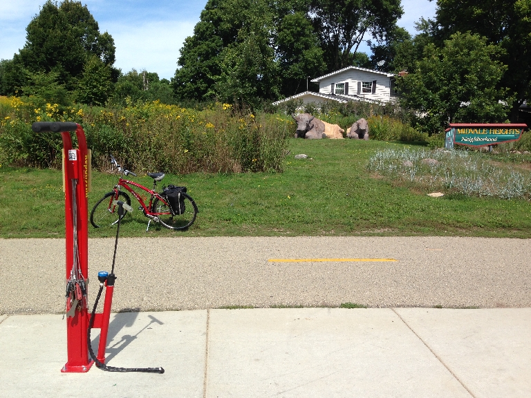 Visited Vera and Bill in Madison, enjoyed good company, food and local sites. Bike rides of 10 and 15 miles provided for a close-up view of the city. I thought this bike service area with rack, tools and pump was a good idea.