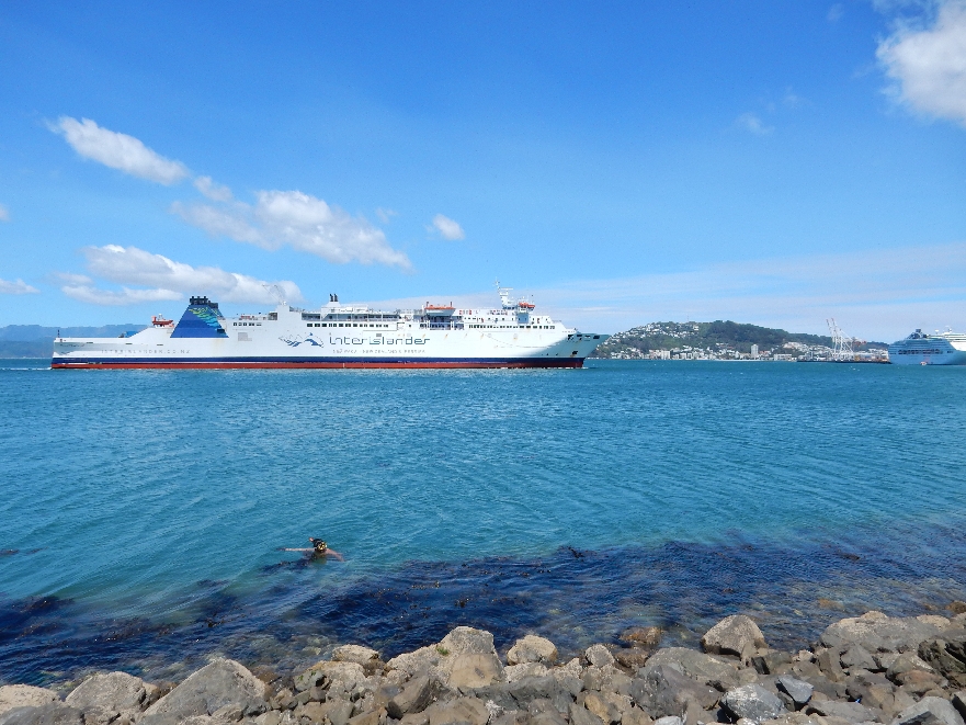 We arrived in Wellington at 12:30 and waited for our ferry to take us to the South Island. It was an hour late coming in so we ended up leaving at 3:45 instead of 2:45. Here is our Ferry arriving late; notice the snorkeler in the foreground diving for shellfish. Wellington is in the background.