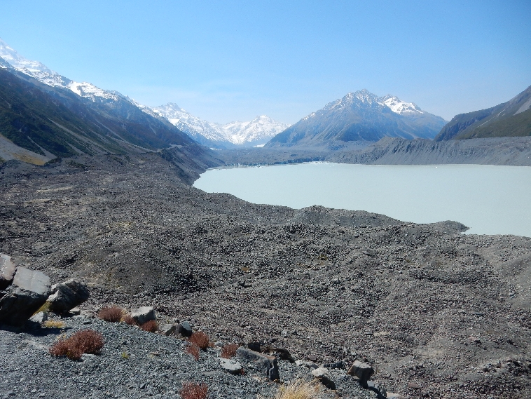 We then did the Tasman Glacier View Walk, which gave us a view further up the valley to the mountains. This is Tasman Lake with the Tasman Glacier at the far end.