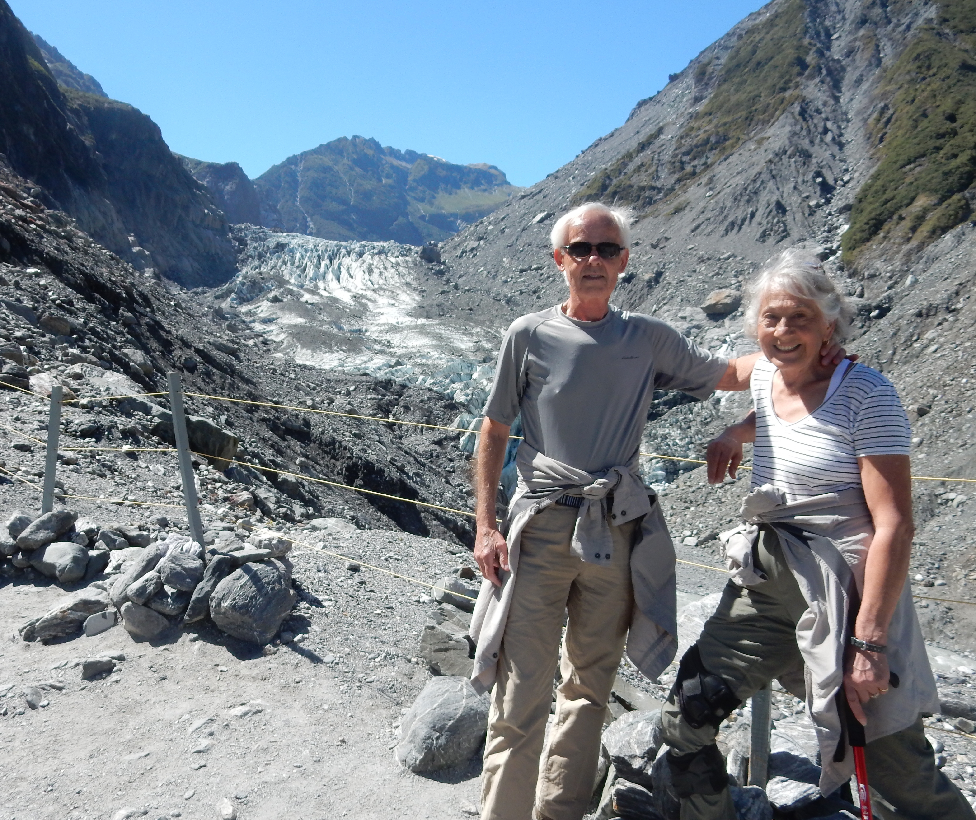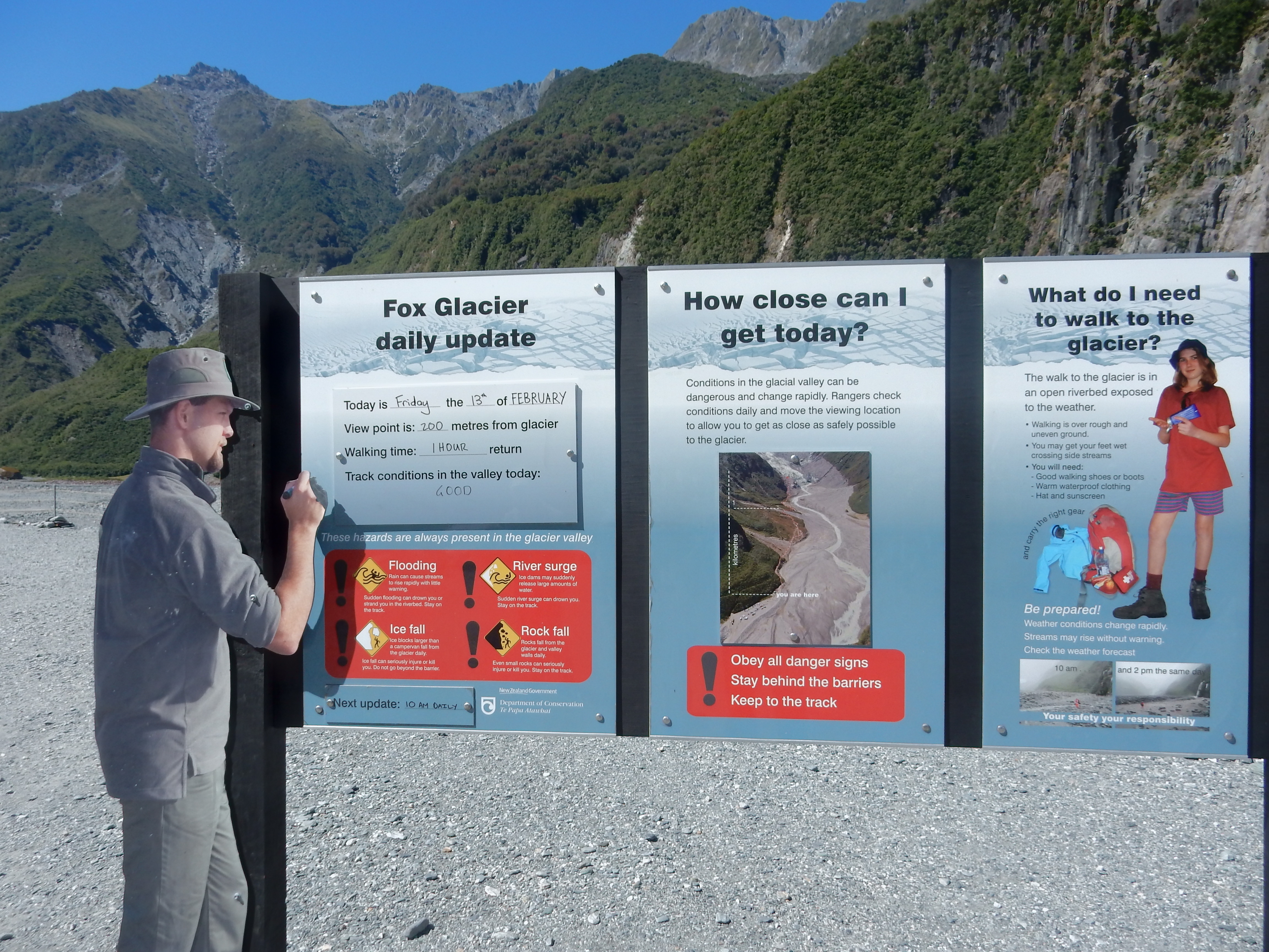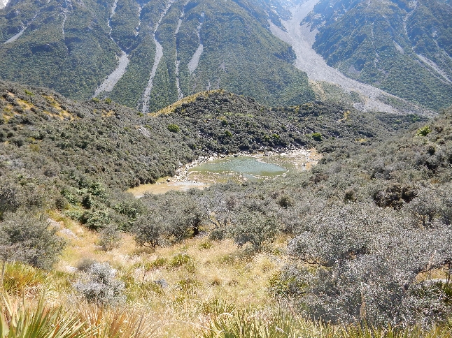 Ate microwave Chicken Pot Pies for lunch in our room and then drove up the Tasman Valley to do the Blue Lakes Walk. The lakes are now green with algae, because they are now filled with rain water instead of glacial melt.