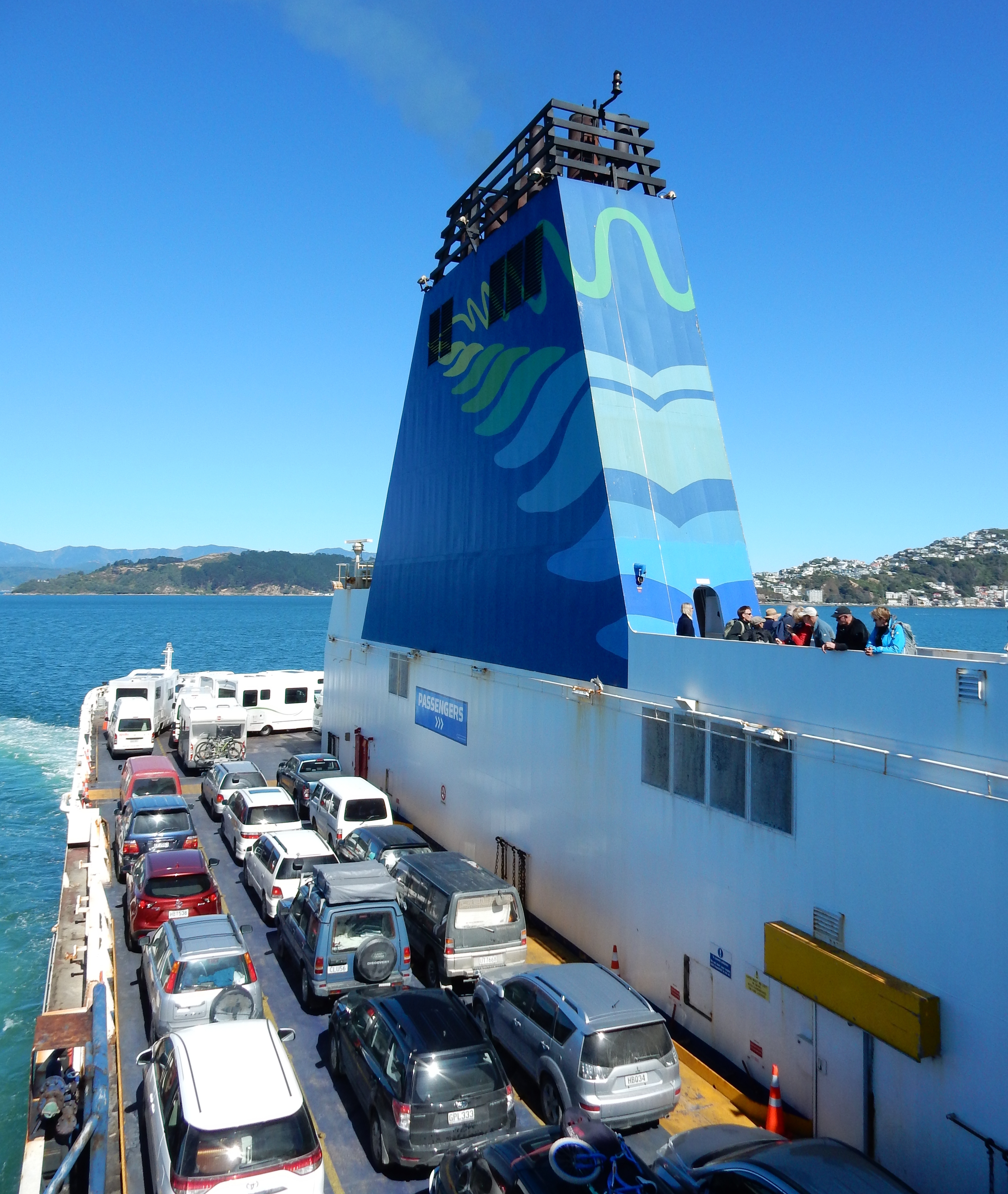 The trip across Cook Straight takes 3.5 hours. Our Interislander Ferry was the Aratere, which can carry 670 passengers, 28 railroad cars or 30 trucks or 230 cars and it was full. As we left Wellington another Interislander Ferry was coming in.