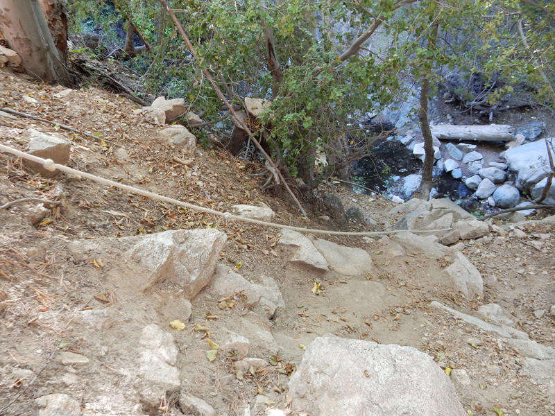 I did not see the drop into the canyon for the falls and hiked about a half mile until I realized that I must have missed it. I headed back and discovered a rope to aid the climb down into the canyon.