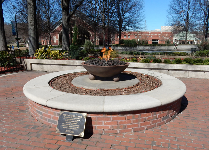 Close-up eternal flame, Ebenezer Baptist Church and Park Visitor Center in background