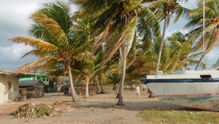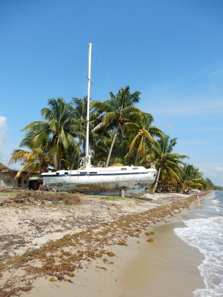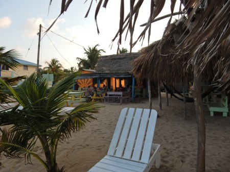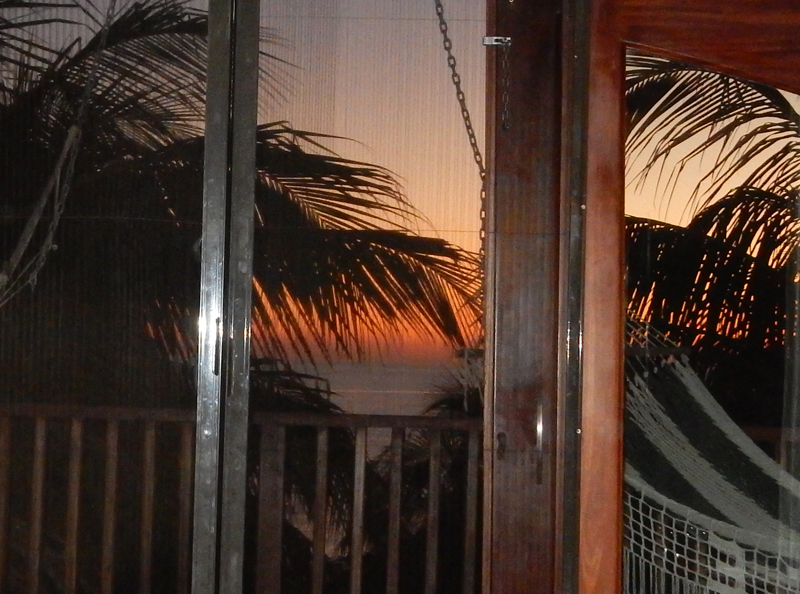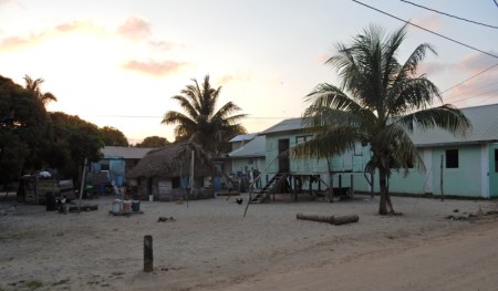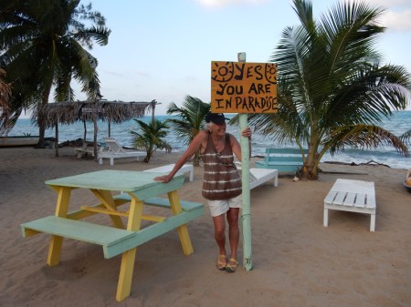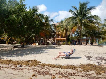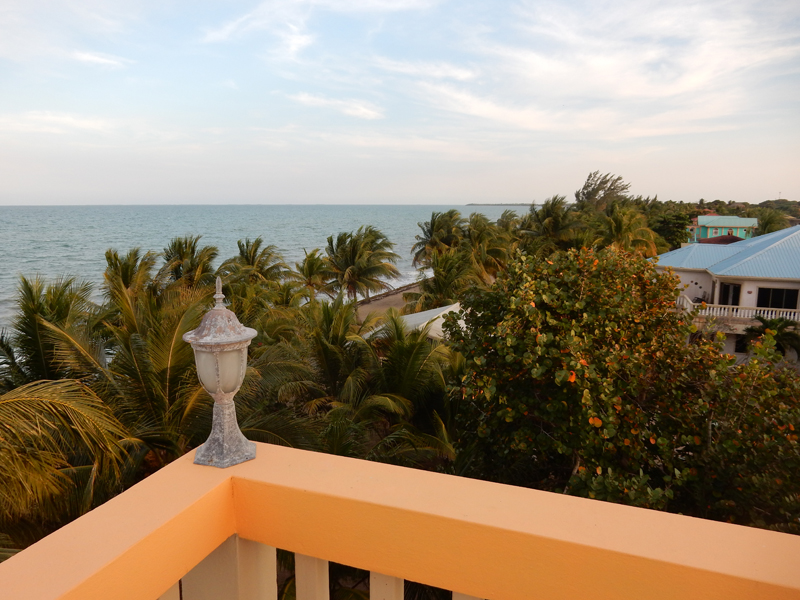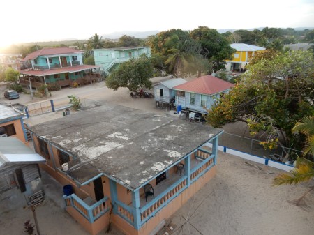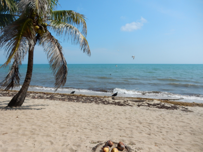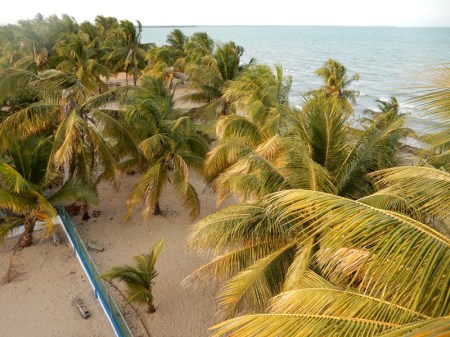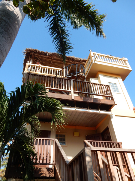 February 19 – flew AA from Miami to Belize and arrived at 11am. Rented a Jeep Patriot (with certification to drive to Guatemala) and then drove from Belize City to Hopkins in the southern part of the country, population 1,800. I chose Hopkins because it was small, on the Caribbean, close to Salt Water Caye Marine Reserve, and still had a Garifuna vibe – that is, relatively untouched by large commercial enterprises. We stayed at the Buttonwood Guesthouse, which is owned by the Coconut Row Guesthouse. Shortly after checking in, we received our fresh coconut with straw and rum added! Our room was on the third floor, highest room in Hopkins! It can be seen in the background of this pic.