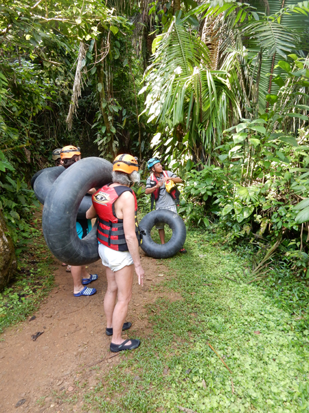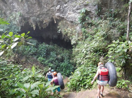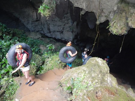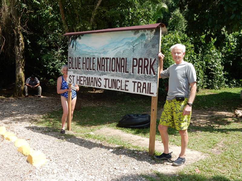 February 21 – This turned out to be a big day for us. Our first stop was St Herman’s Blue Hole National Park. I had planned to just hike to the cave and then take a dip in the Blue Hole. However, after speaking with the ranger, we decided to also do the Cave Tubing. A guide is required ($50 each) for this 2-hr underground adventure. We donned our helmets, head lamps and PFDs and hiked to the cave entrance.